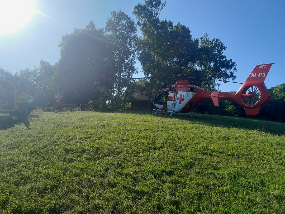 Na Novojičínsku se převrátil traktor. Pro zraněného muže letěl vrtulník