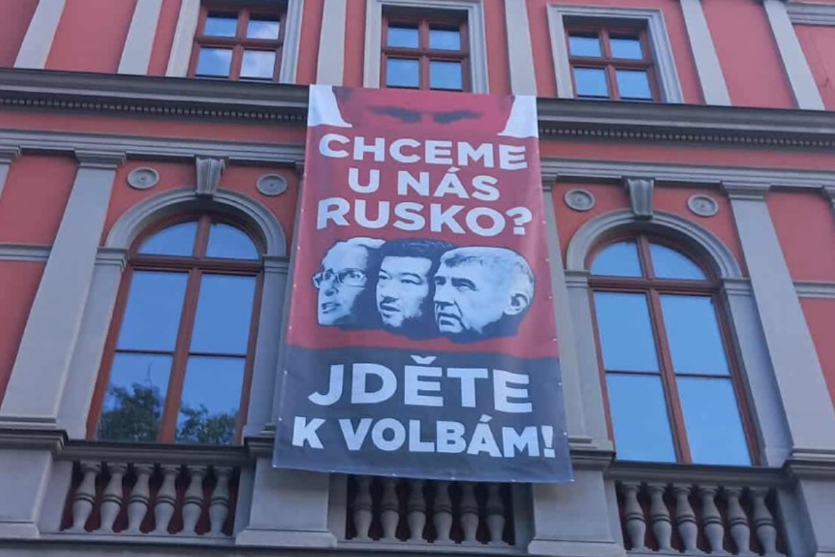 Plakát skupiny Kaputin s českými politiky a Putinem doputoval do Opavy