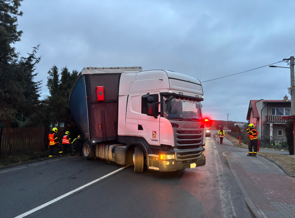 Silnici I/57 mezi Opavou a Krnovem blokuje kamion, řidič vjel do příkopu