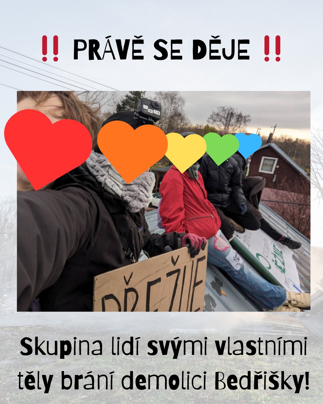Lidé brání demolici domů v Bedřišce. Fotografii sdíleli na svém Facebooku.Dodal, že obvod kontaktoval policii a požádal ji o pomoc. "Dům v tuto chvíli zůstane tak, jak je. Vůbec nevím, co bude následovat, ale nemáme v plánu tu situaci eskalovat. Naopak jsem se sem přijel podívat, chtěl jsem s místními promluvit, ale tady to spíše eskalují ti lidé dole," podotkl Hujdus. Dodal, že nasmlouvaná firma nyní pracuje v jiné části osady. "Bohužel máme informace, že jim byly poškozeny i nějaké stroje a vznikla nějaká škoda na zařízení. To už ale firma bude řešit v rámci pojistky a komunikace s kompetentními orgány," doplnil starosta.