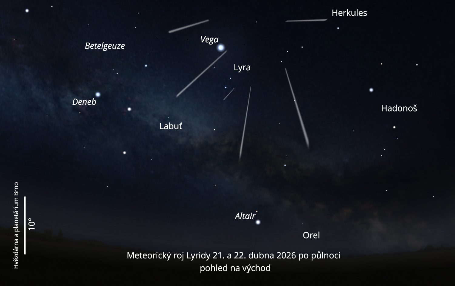 Druhá polovina dubna tradičně patří jednomu z nejstarších známých meteorických rojů, Lyridám. Letos vychází po celém Česku velmi dobré podmínky k pozorování. I když se nečeká nijak mimořádně vysoká aktivita, na noční obloze budete moci sledovat řadu padajících hvězd.